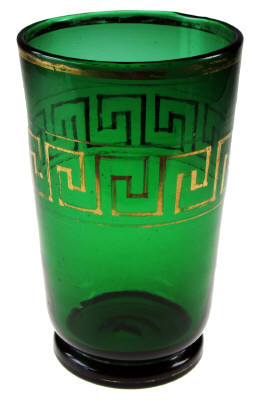 An early 19th-century green glass tumbler gilded with a key-fret band and linear border in the manner of Isaacs, Bristol