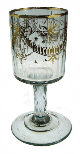 A late 18th-century glass goblet with multi-faceted bucket-form bowl, gilded with neo-classical swags and garlands in the manner of James Giles, on facet-cut stem and plain stepped circular foot