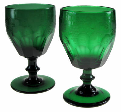A pair of early Victorian green glass " rummers", the lower bowls faceted, the upper egraved with fruiting vines, on annular-knopped stems and plain circular feet