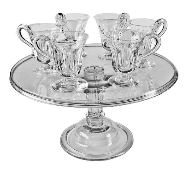 An 18th-century glass tazza with raised folded edge to the circular top, on Silesian pedestal stem and domed and folded foot, and an associated set of six early 19th-century jelly glasses
