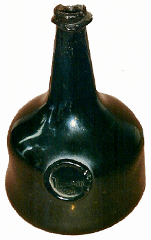 A sealed wine bottle of dark green metal, the seal inscribed "Kirktoun / 1734". The seal appears to be unrecorded but was found in an original cottage situation and is probably therefore local to Cumberland