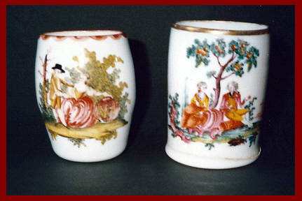 Two 18th-century Bohemian opaque white glass mugs, with polychrome enamelled arcadian landscapes with figures