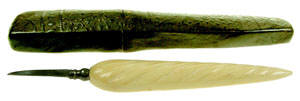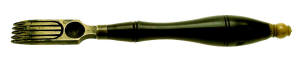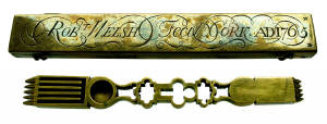 A typical wooden-handled brass rastrum for ruling musical staves, 130mm, and a superb and unique brass double-ended rastrum in its original pocket case signed "ROBERT WELSH Fecit CORK AD1765 ", 150mm, (overall)