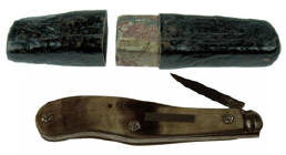A late 18th-century quill knife with spirally fluted tapering bone handle, the blade marked "I" over a heart, in decoratively tooled boiled leather pocket case, 176mm, (overall)