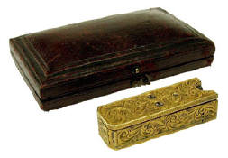 A rare George IV gilt-brass quill-cutting machine, finely engraved with an all-over design of foliate scrollwork, marked "M" and "LONDON" for Sampson Mordan , 44mm long, in red morocco pocket case, plush-lined, 82mm long