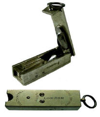 A rare nickel mechanical quill cutter with needle-threading device, by Holtzapffel, London, Maker, Charing Cross, Patent Nos. 456 and 789, 48mm long excluding ring suspender