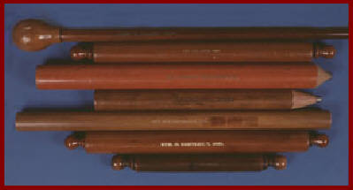 A group of Keswick-made cedarwood goods made for the tourist market by pencil manufacturers like Hogarth and Hayes, including a pencil walking stick, cylinder rules and oversize pencils