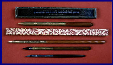 A group of early to mid 19th-century steel-pointed dip pens by Joseph Gillott of Birmingham, the top example a barrel nib about 120mm long and .......