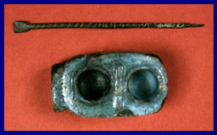 An ancient Roman bronze stylus for writing on a wax tablet, and an ancient Egyptian turquoise-glazed cartouche-form doulbe inkwell