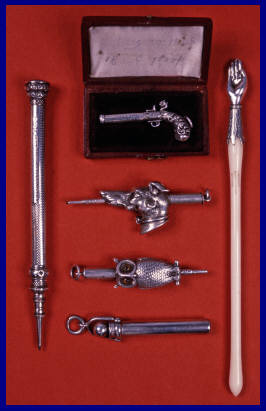 A group of 19th-century novelty silver propelling pencils and an ivory and silver dip-penholder, by Sampson Mordan of London, a firm who specialised in such novelties