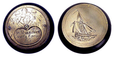 Two Carlisle-made snuffboxes of copper alloy and wood, designed to restrict the pinch of snuff available to almost nothing as the two fingers used are forced apart as they are withdrawn through the access holes, early 19th century, 69mm diameter