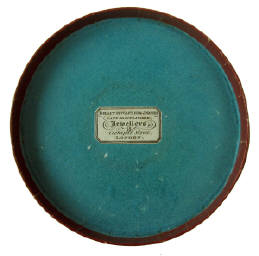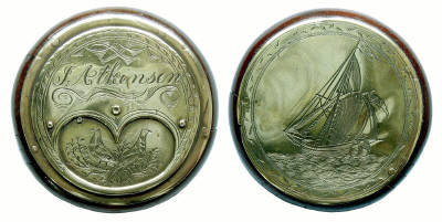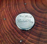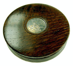 An oak box, with two silver escutcheons, one engraved with a setter dog and "John Robinson, Skinner, Penrith", the other "Presented by James Brogden.... " and dated 1832, 76mm diameter