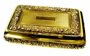 A George III silver-gilt snuffbox of rectangular form with rounded corners, having engine-turned decoration within cast foliate borders, hallmarked Birmingham, 1818, maker Joseph Willmore, 81mm long, 108.4gm