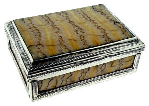 An 18th-century silver-mounted snuffbox with panels of thinly sliced fossilised mammoth tooth, 69mm long