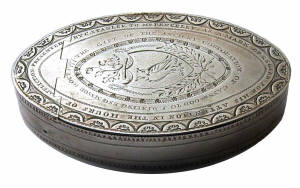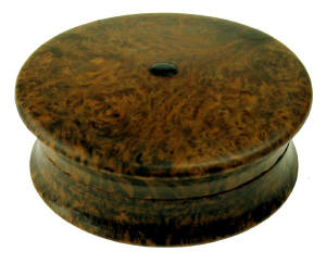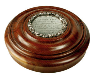 A superb yewwood circular table snuffbox of turned design, in its original red card box with interior retailer's paper label of BRAITHWAITE & JONES (of 3 Cockspur Street, London), the push-on lid inset with a circular silver medallion within a cast foliate border, engraved: "In Rememberance / & Presented to /