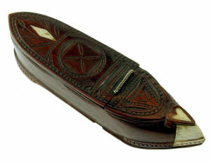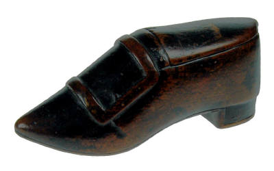 An early 19th-century bone-inlaid treen snuffbox in the form of a sabot, with heart as a love token, 107mm long