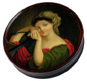 A mid 19th-century papier mâché snuffbox, the push-on cover finely painted with a bust-length female figure holding an anchor, allegorical of "Hope", 96mm diameter