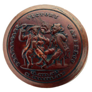 An early 19th-century pressed wood snuffbox, the cover depicting Chelsea and Greewich pensioners and commemorating the victories of Trafalgar and Waterloo, signed on a chair-leg, "WESTFIELD", 72mm diameter