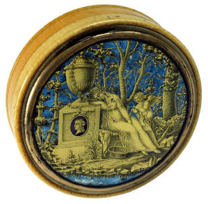 A fine late 18th-century French ivory snuffbox, the push-on cover inset with a blue-ground verre-eglomisé panel depicting a lady mourning at a tomb, perhaps a victim of the Revolution's guillotine, 83mm diameter