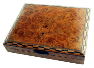 A 20th-century burr yewwood snuffboxof fine quality, with ebony and holly chequered stringing,80mm long
