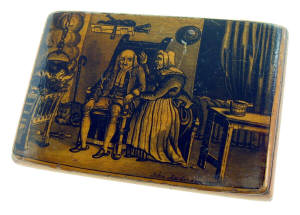 An early 19th-century Mauchline sycamore snuffbox painted in black with a satirical scene from Burns's "John Anderson my Jo", 77mm long