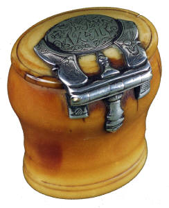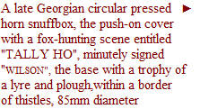 A late Georgian Scottish silver-mounted snuff mull, made from half a deer's hoof carved in relief with a depiction from Burns's "Cutty Sark", the silver cover inset with a heliotrope seal engraved with a running fox and legend "TALLY HO", 80mm long