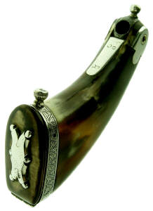 An early 19th-century horn snuff mull or priming flask,, the cover having silver mounts, with swivel dispenser, 110mm overall