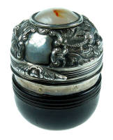 An early 18th-century small horn mull, the Baroque-style chased silver cover inset with a Scottish pebble of agate with carnelian inclusions, 52mm high