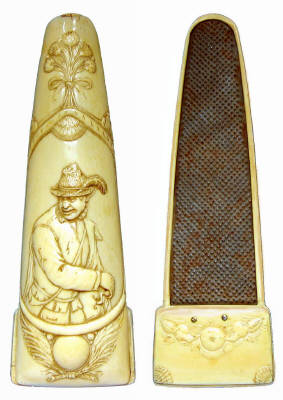 Snuff is finely ground tobacco leaf with aromatic additions; in the 18th century rasps such as this in ivory or wood, with a rasp for the tobacco and a hinged receptacle to catch the snuff, were a necessary requirement for the elegant gentleman, as was a finely carved snuff spoon with which to transfer the snuff from snuffbox to the hand.