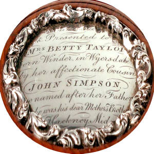 BETTY TAYLOR / born Winder, in Wyersdale, / by her affectionate Cousin / JOHN SIMPSON / so named after her F / who was his dear Mother's Brother / Hackney Mid / 1836", the interior lid having a circular escutcheon engraved "Yew Wood / Lyndeth Crag", the snuffbox 95mm diameter