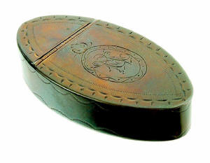 A late 18th century copper navette-shaped snuffbox bright-cut engraved in the neo-classical style, 65mm long