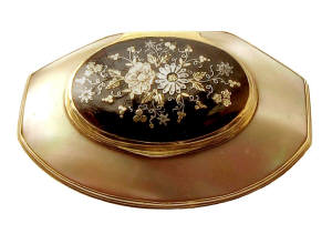 A fine 18th-century gold-mounted mother-of-pearl snuffbox of truncated oval form, the hinged cover inset with a tortoiseshell panel of gold and silver piqué posé flowers, 65mm long