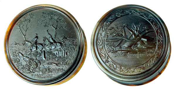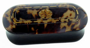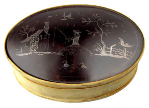 An early 18th-century oval blonde horn snuffbox with push-on tortoiseshell cover, having a silver piqué scene depicting an angler, 79mm long
