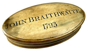 A George III cowhorn snuffbox engraved "JOHN BRAITHWAITE / 1793", 118mm long.