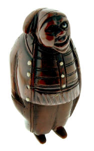 An early 19th-century Napoleonic prisoner-of-war carved coquilla-nut snuffbox in the form of a French Revolutionary, with "stocking" cap, 75mm high