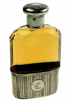 A silver-gilt and glass pocket spirit flask with facet-cut shoulders, silver screw-on cover and engine-turned fitted cup engraved with the crest of Colonel Hilliard, hallmarked London, 1910, 123mm high