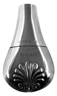AWilliam IV Irish silver spirit flask in the form of a shell-decorated gunpowder flask, hallmarked Dublin, 1831, maker Henry Flavell, engraved "JOHN FLEMING / CARLISLE", 155mm high