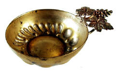 A miniature silver-plated brass wine taster, the handle in the form of fruiting vine, the bowl 56mm diameter, maker's mark "ML under a star"