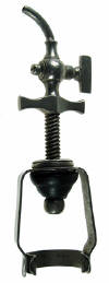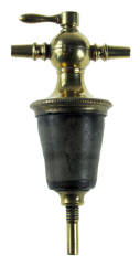 A brass mounted champagne-bottle rubber stopper, the tap with alternative spigots maked "P" and "N", the central position marked "OFF", 95mm long