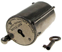 A Victorian nickel Burns's Patent Bottle Lock, marked "BY HER MAJESTY'S ROYAL LETTERS PATENT, with key, 55mm high