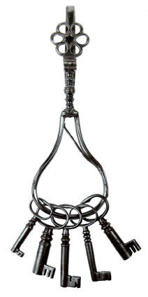 A late Georgian cut-steel belthook key holder, with teardrop ornament, 145mm long , (excluding keys)