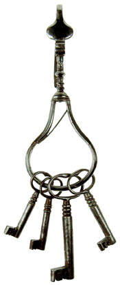 A late Georgian cut-steel belthook key holder, with pierced rosette ornament, 163mm long , (excluding keys)