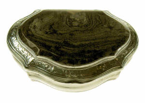 An 18th-century silver-mounted snuffbox with panels of thinly sliced fossilised mammoth tooth, 69mm long