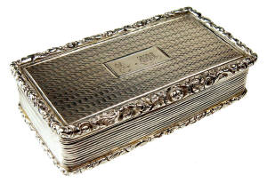 A George III silver-gilt snuffbox of rectangular form with rounded corners, having engine-turned decoration within cast foliate borders, hallmarked Birmingham, 1818, maker Joseph Willmore, 81mm long, 108.4gm
