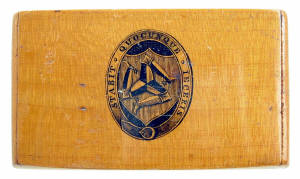 An early 19th-century Mauchline sycamore snuffbox painted in black with the triskeles within a garter with the motto"STABIT QUO CUNQUE INCERTS", 77mm long