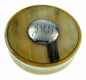 A 19th-century horn box with push-on cover, the escutcheon with maker's mark W.D. & Co, for William Dunningham of Aberdeen, specialists in silver-mounted horn